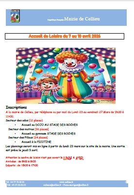 L’accueil de loisirs vacances sera ouvert du 24 au 28 avril, inscriptions du lundi 3 avril au samedi 8 avril.